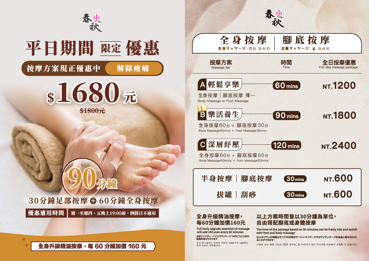 - 全身筋脈按摩 60min→NT.1200